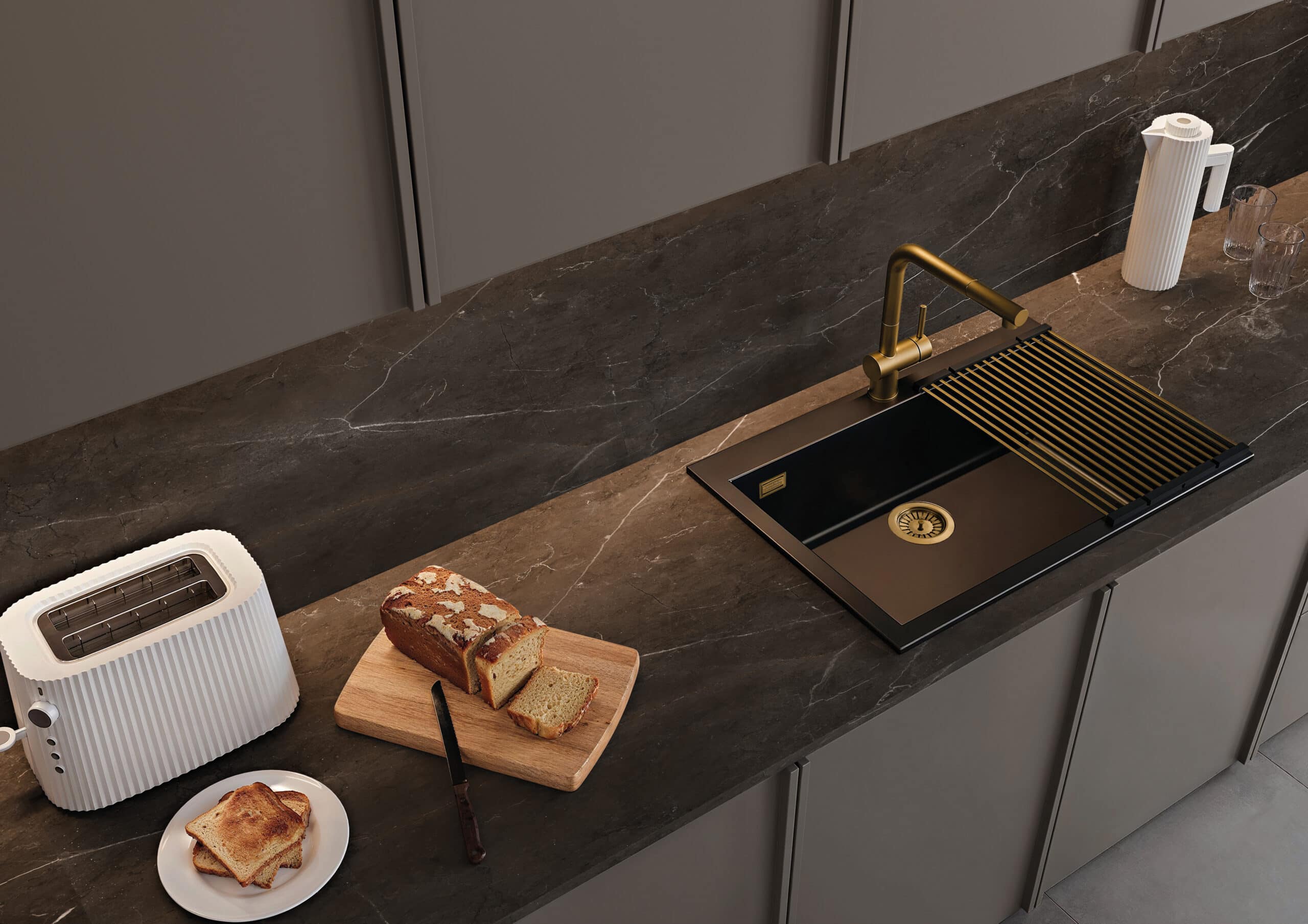 金属颗粒、石英和花岗岩赋予水槽金属色调,与现代环境和不锈钢完美搭配。易于清洁、卫生、耐划痕、耐化学品和高温。
