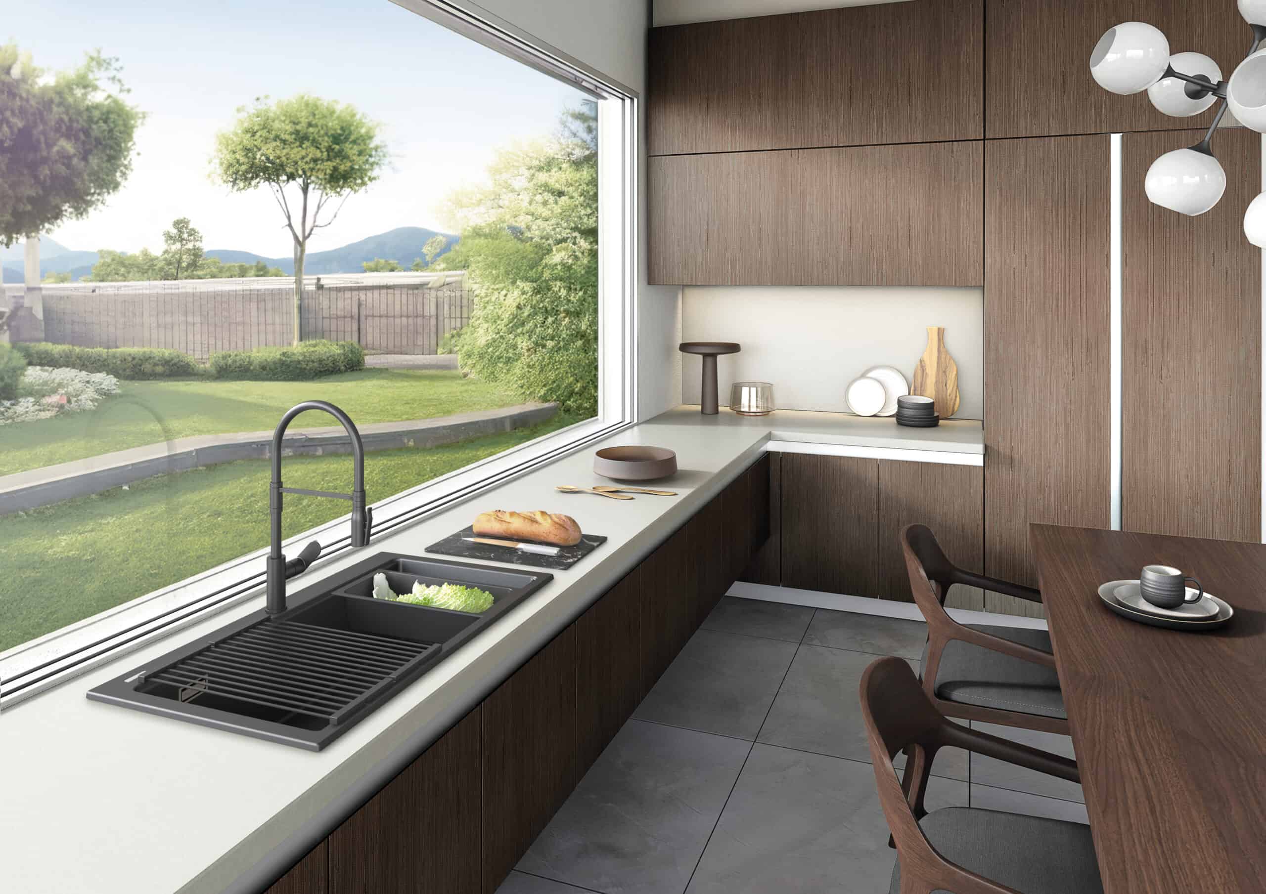 金属颗粒、石英和花岗岩赋予水槽金属色调,与现代环境和不锈钢完美搭配。易于清洁、卫生、耐划痕、耐化学品和高温。