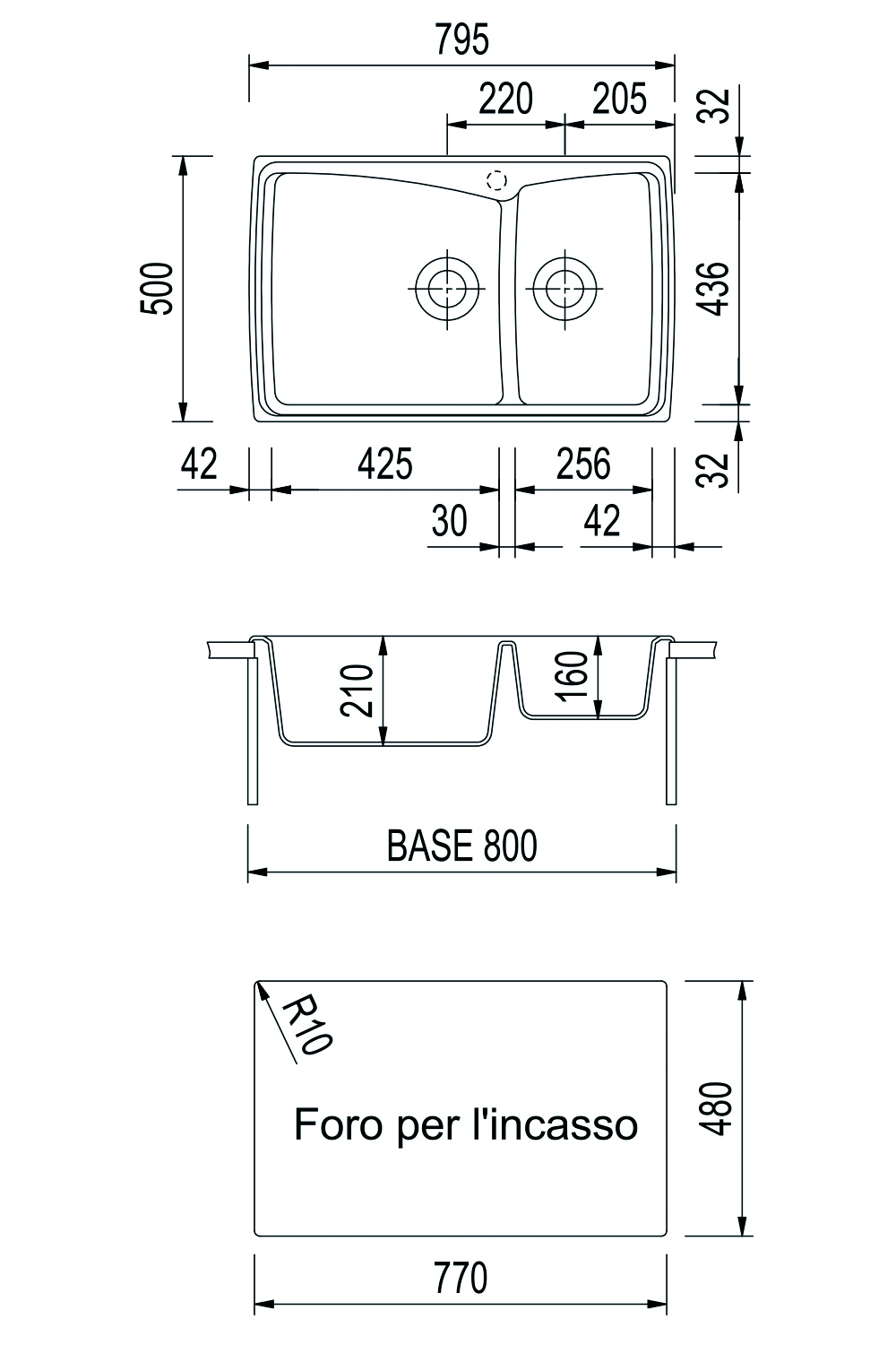 790×500毫米--双槽水槽,带预钻孔,用于安装one水龙头和配件。
