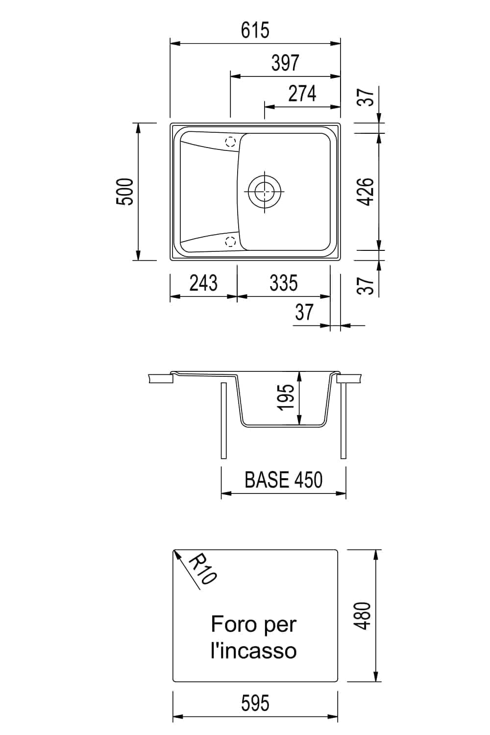 615×500毫米 - 单槽水槽加滴水盘,可翻转,有预钻孔,可安装one水龙头和配件。