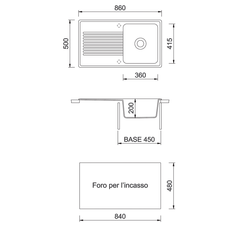 860×500毫米--单槽水槽加滴水盘,可翻转,有预钻孔,可安装one水龙头和配件。
