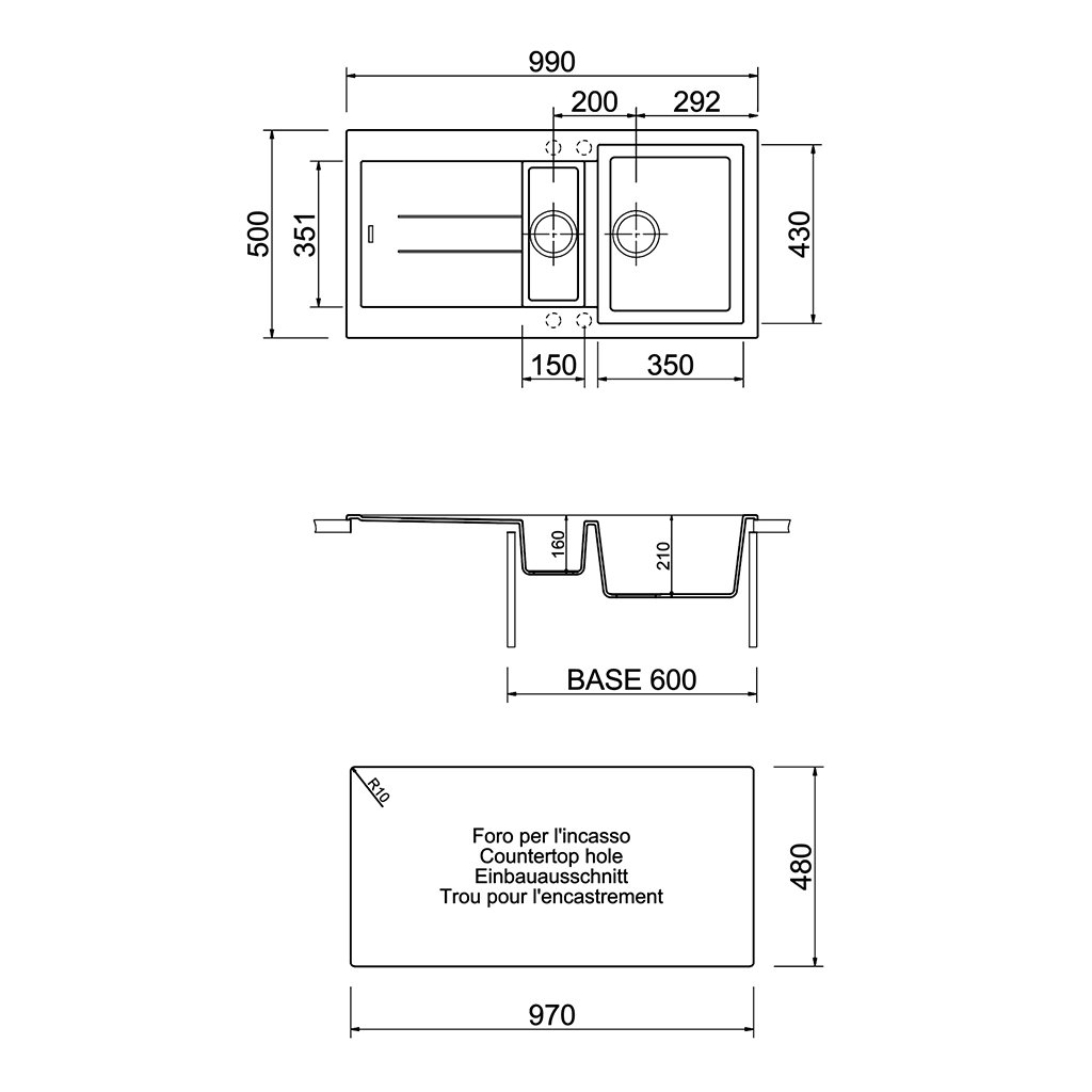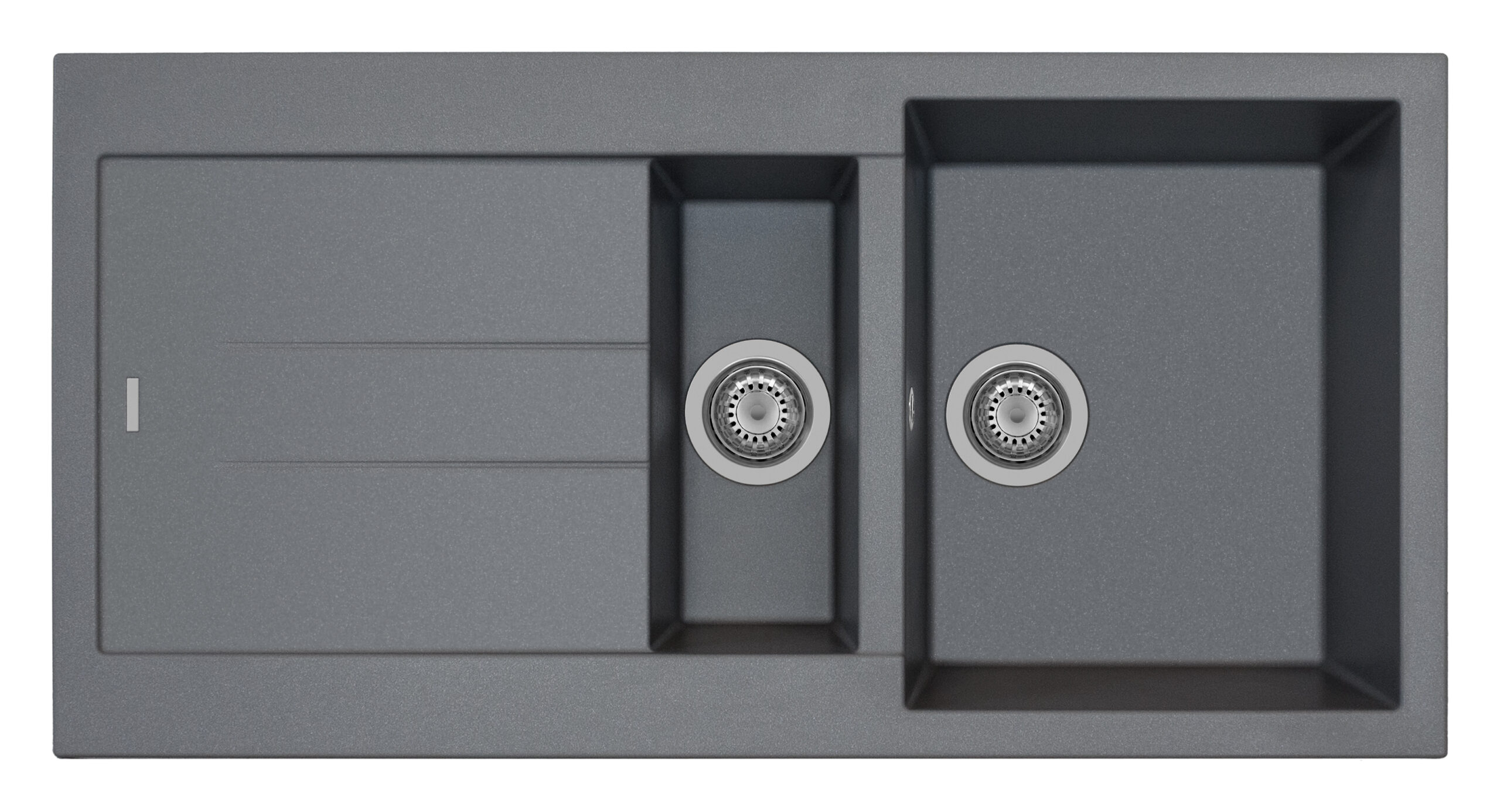 990×500毫米 - 一个半碗水槽加滴水盘,可翻转,有预钻孔,可安装one水龙头和配件。