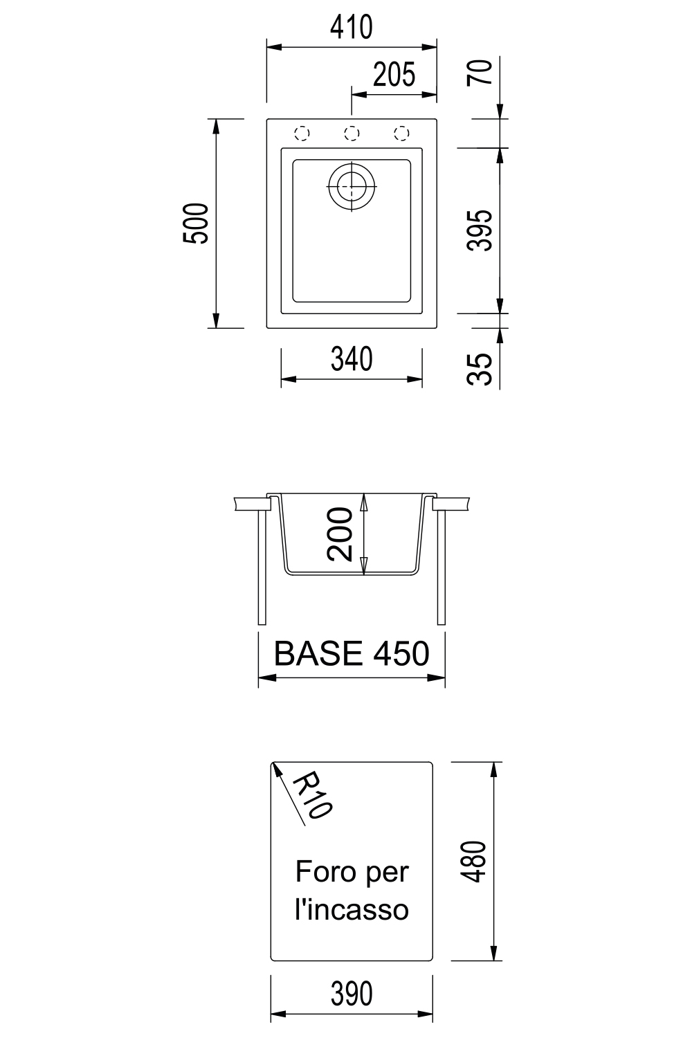410×505毫米 - 单槽水槽,有预钻孔,可安装one水龙头和配件。