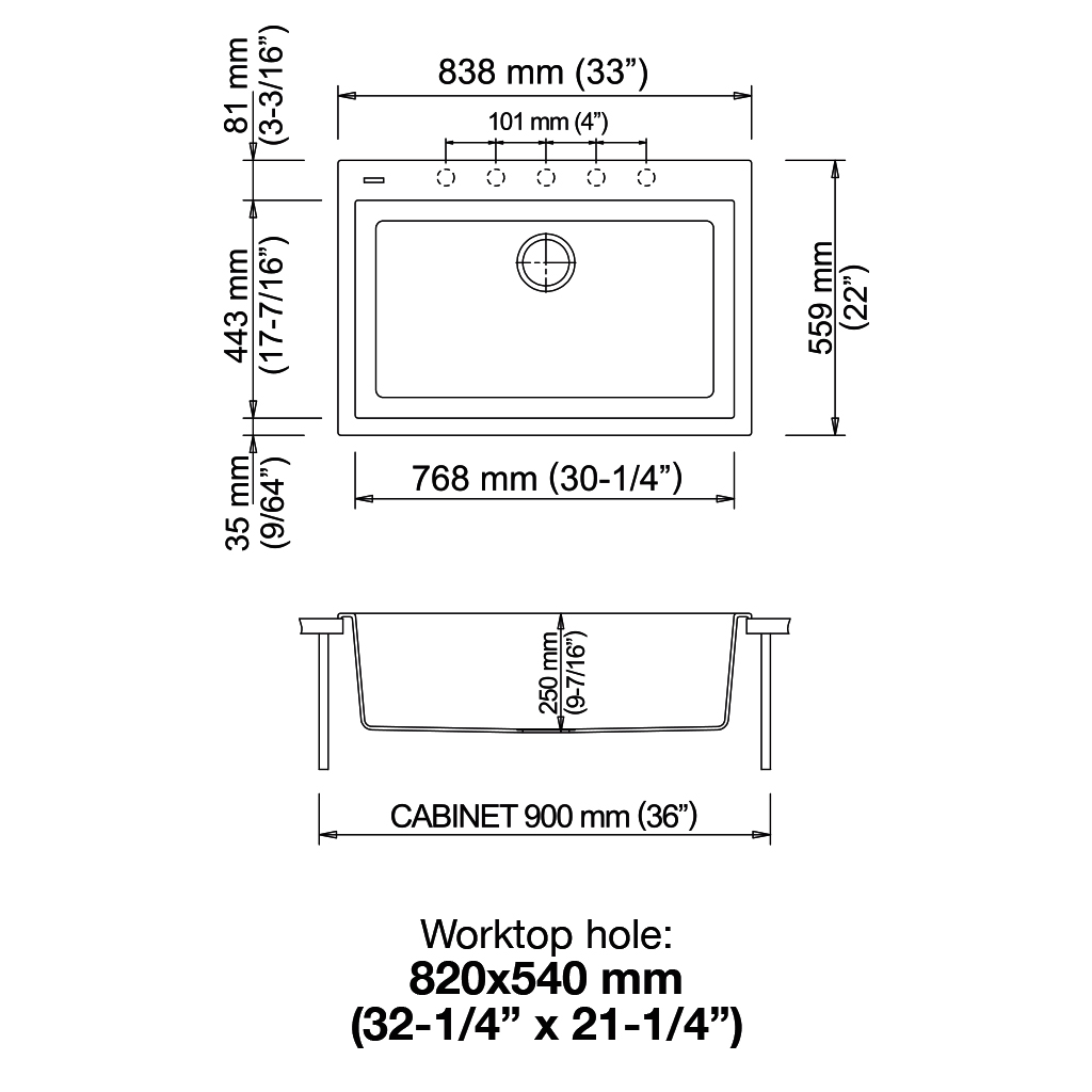 840×559毫米 - 单槽水槽,有预钻孔,可安装one水龙头和配件。