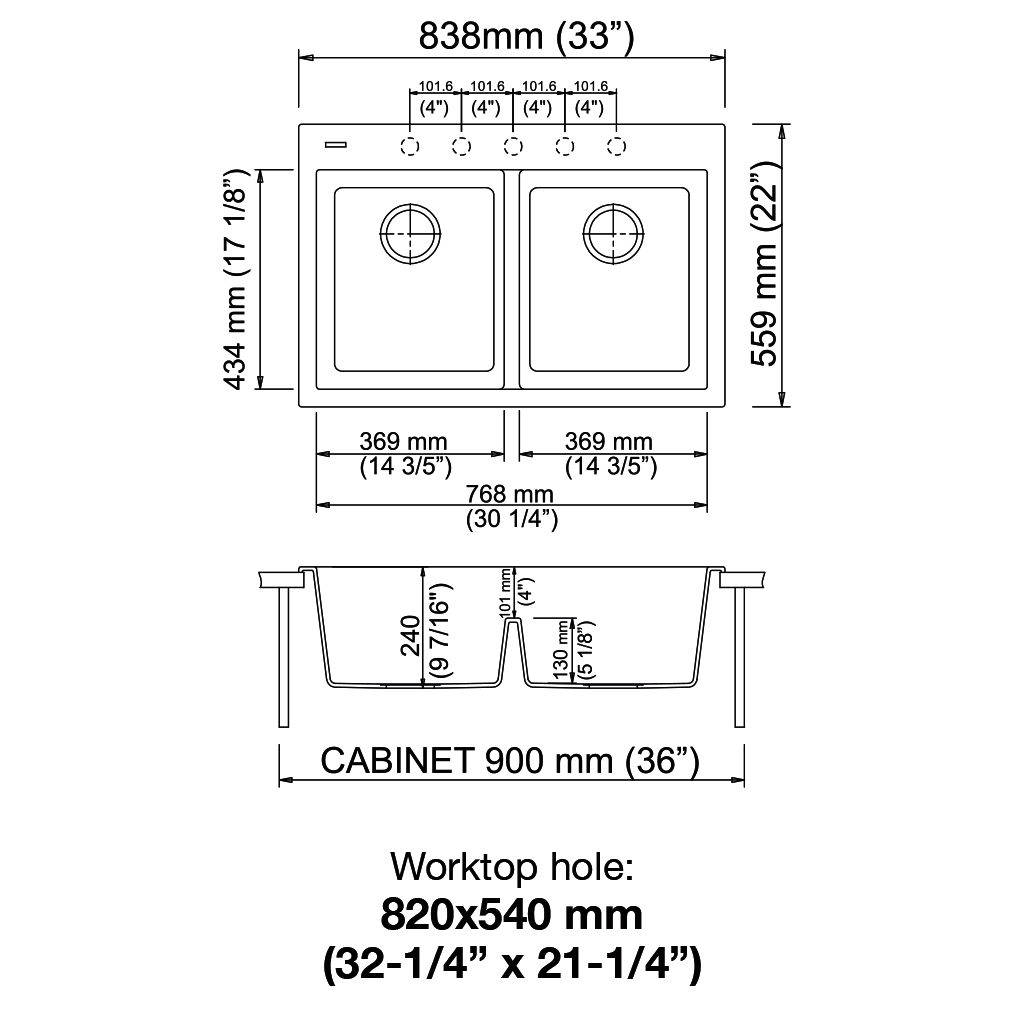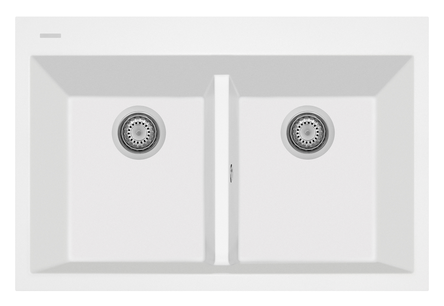 838×559毫米 - 双槽水槽,有预钻孔,可安装one水龙头和配件。