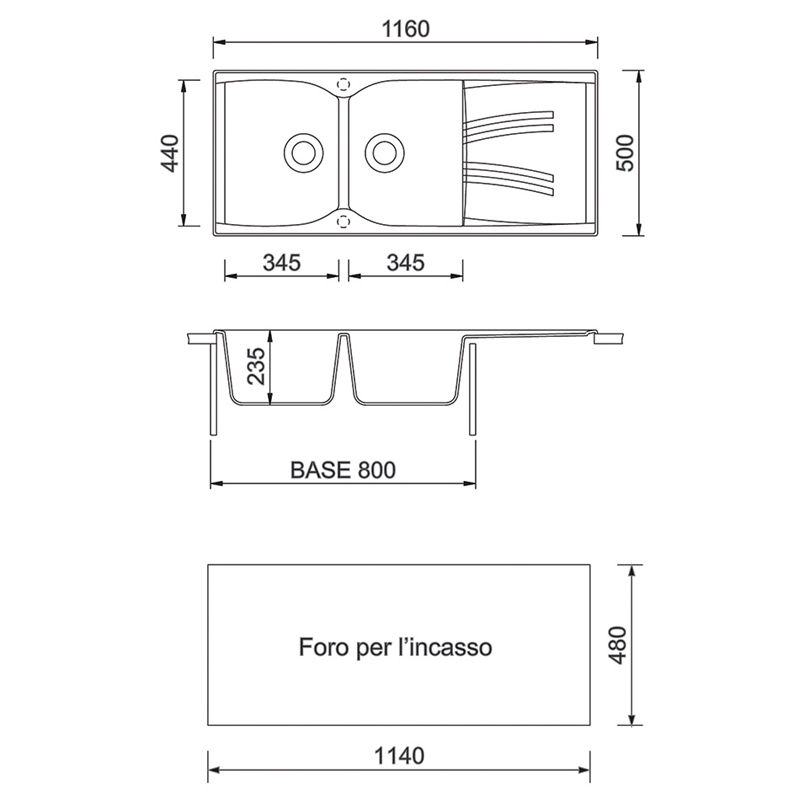 1160×500毫米 - 双槽水槽加滴水盘,可翻转,有预钻孔,可安装one水龙头和配件。