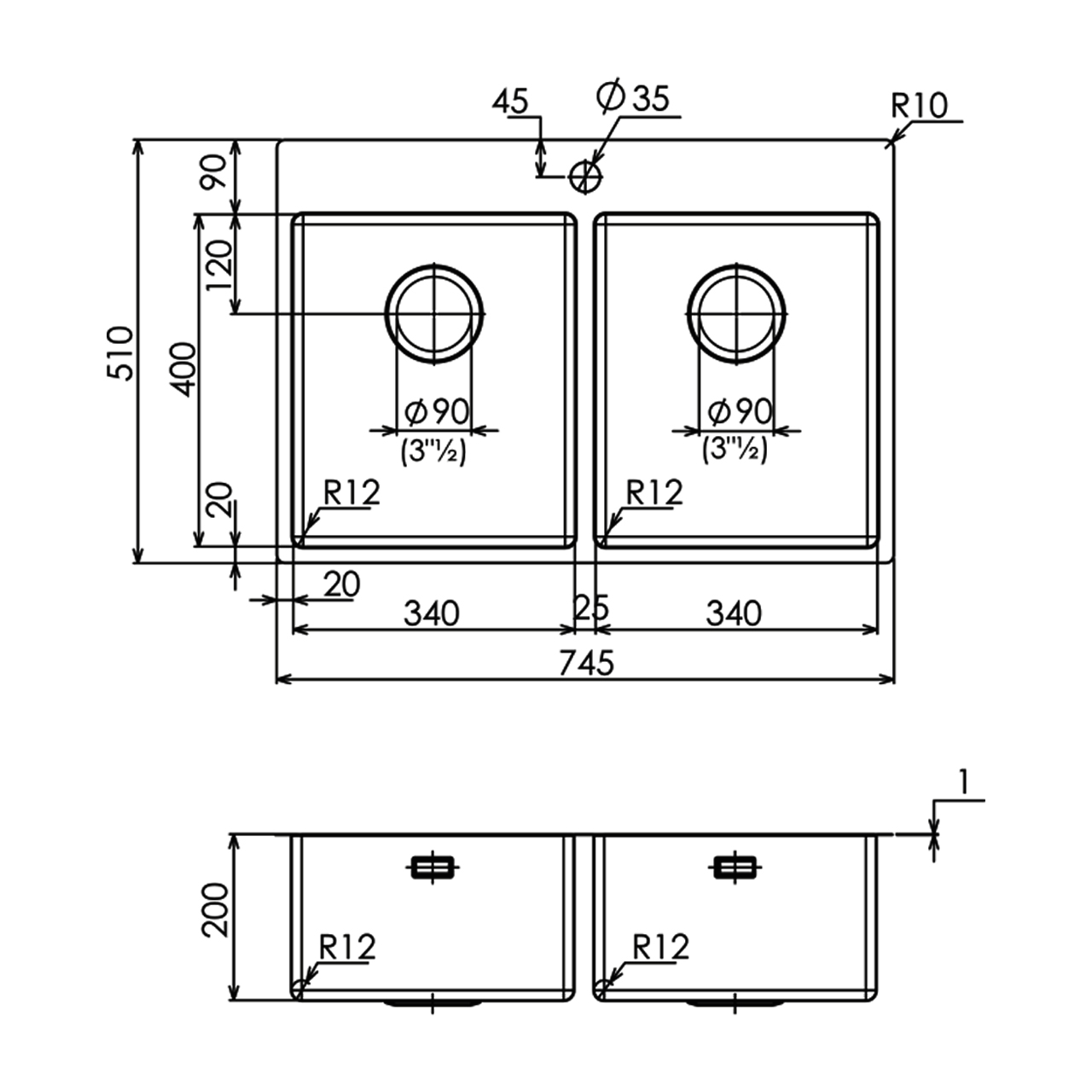745×510 毫米 - 用于安装 one 超薄型/低顶双盆水槽