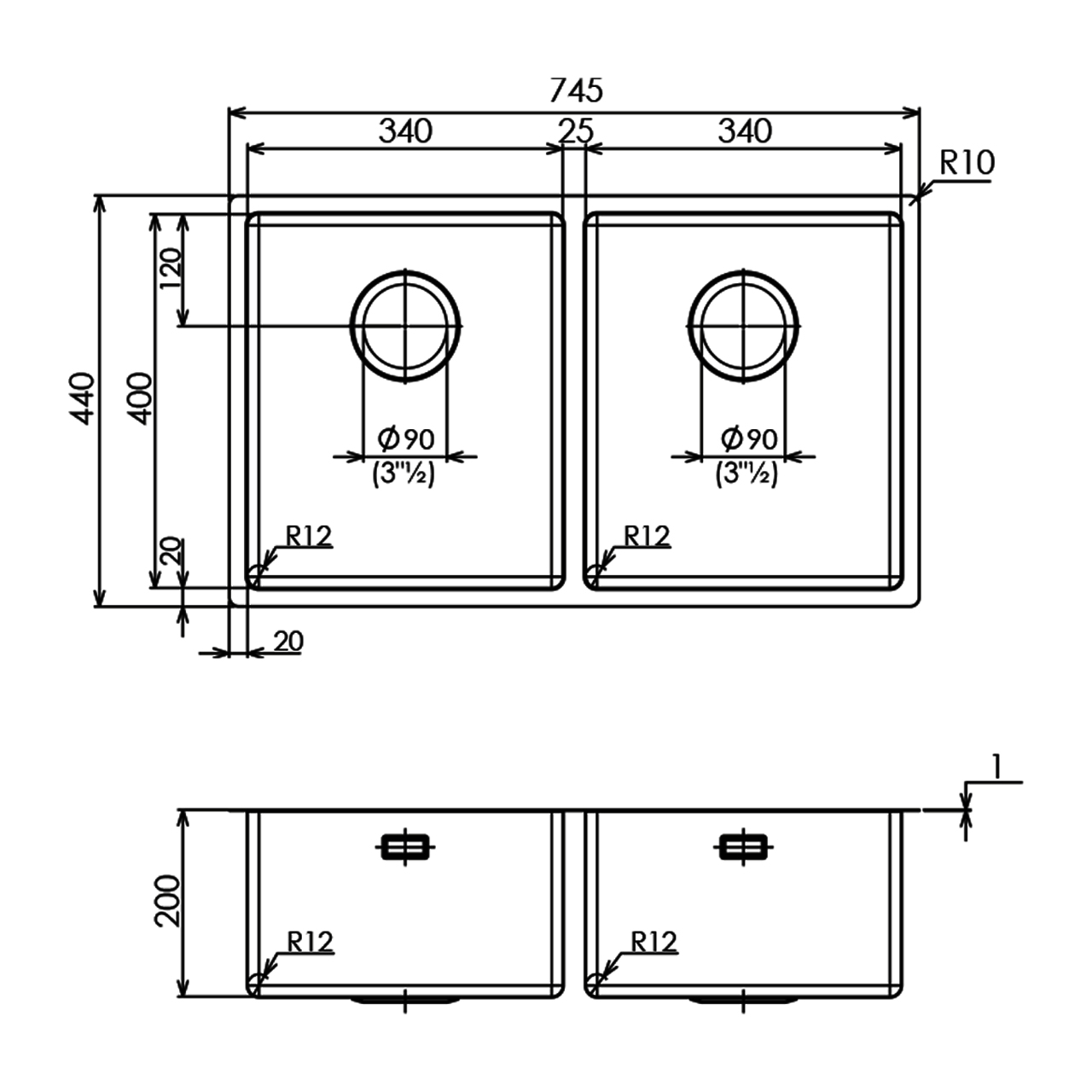 745×440毫米 - 双槽水槽,不锈钢,用于安装one slim/filo-top